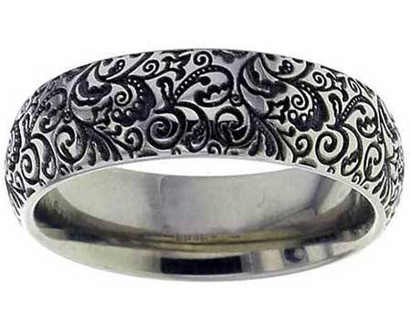 A 7mm width wedding ring made by GETi in the UK from titanium. The ring comes in a domed profile and features a floral pattern engraving. The pattern is continuous with no join, and the engraved surface itself is quite textured. A polished or a satin finish is available.